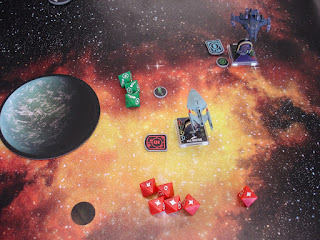 The Scimitar did a 4 come about manouver and dropped Anti-matter mines on the Battleship, not doing a lot of damage but stopping my Cruiser from completing the swing-around that I had managed to complete in the previous game:
